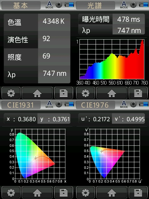在Simple(簡(jiǎn)要)模式下,直接讀取CCT(相關(guān)色溫)、CRI(顯色指數(shù))、LUX(照度)、λP(主峰波長(zhǎng))。