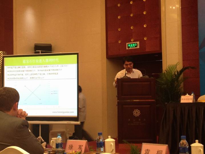 圖為北京合能陽光新能源技術(shù)有限公司總經(jīng)理肖宗杰作了《微利時代下的藍寶石品質(zhì)控制》的專題演講 。