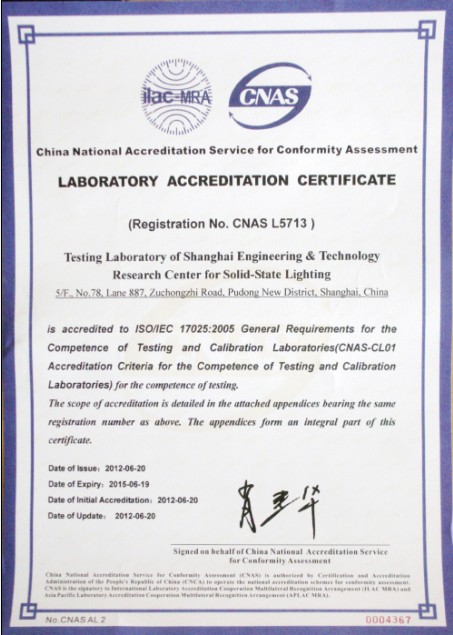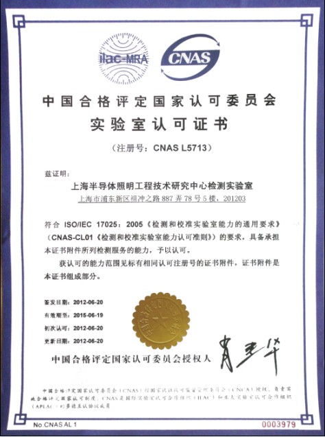 上海半導體照明工程技術研究中心檢測實驗室於2012年5月22日獲得中國計量認證CMA資質;於2012年6月20日正式獲中國合格評定國家認可委員會(CNAS)檢測實驗室能力認證(注冊編號:L5713)。